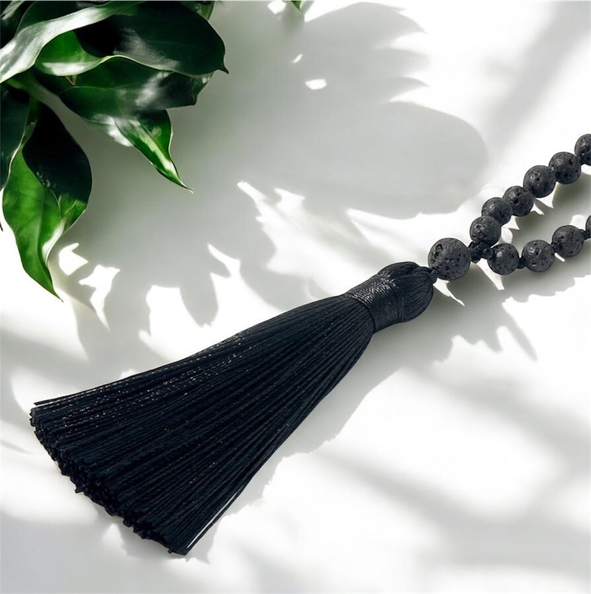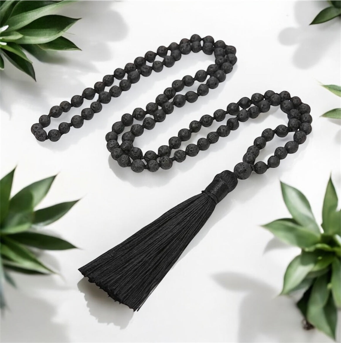 This 108-bead Japamala, handcrafted with 6mm Lava Stone, is a sacred tool designed to anchor your energy, enhance resilience, and support personal transformation.