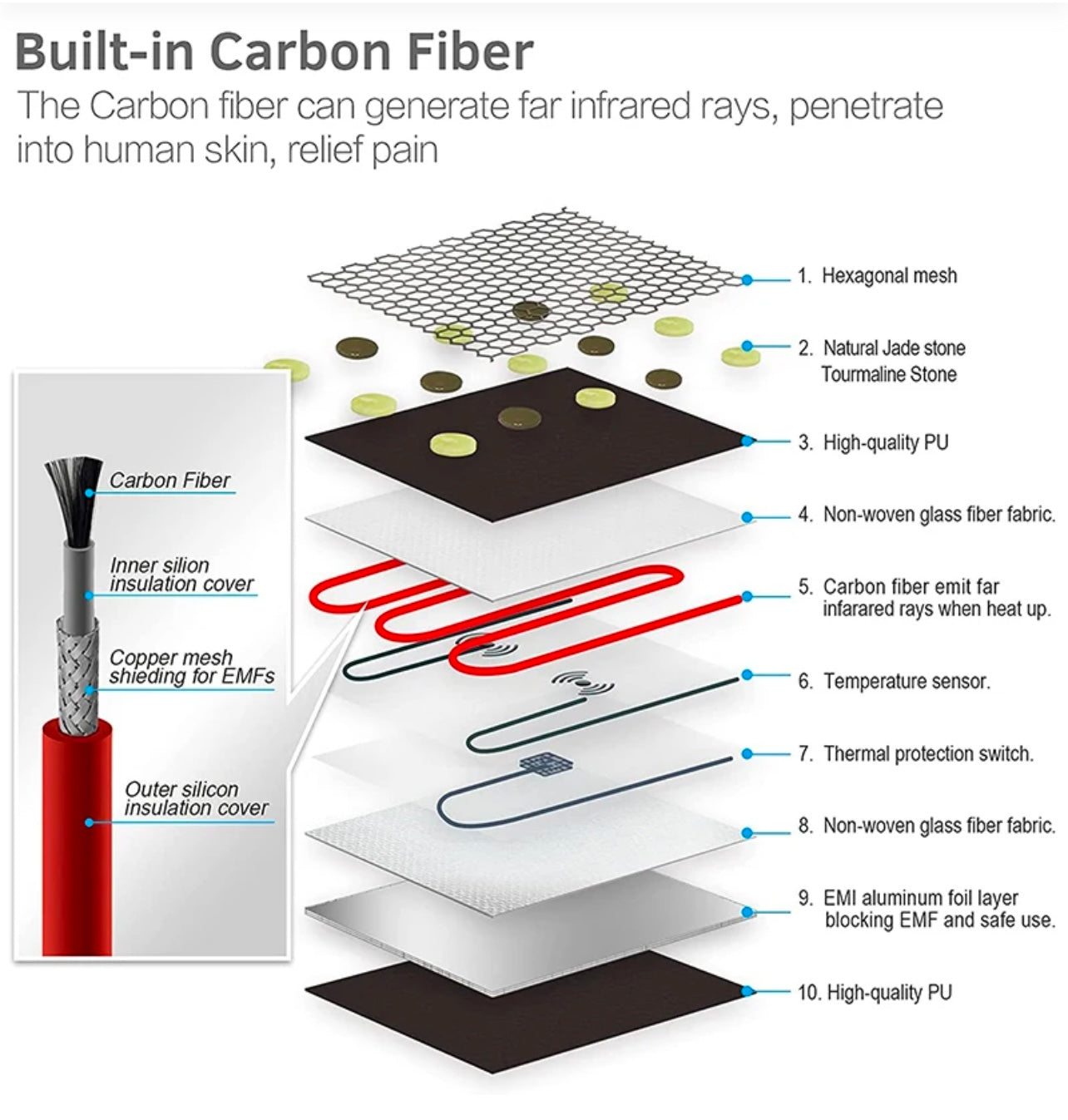 • Carbon fiber heating & EMF protection ensure safe and effective therapy.